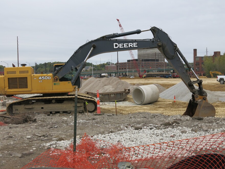 Construction workers are digging a long trench for a new, six-foot storm sewer. But the ditch is quickly filling up with a lot more groundwater than anticipated.