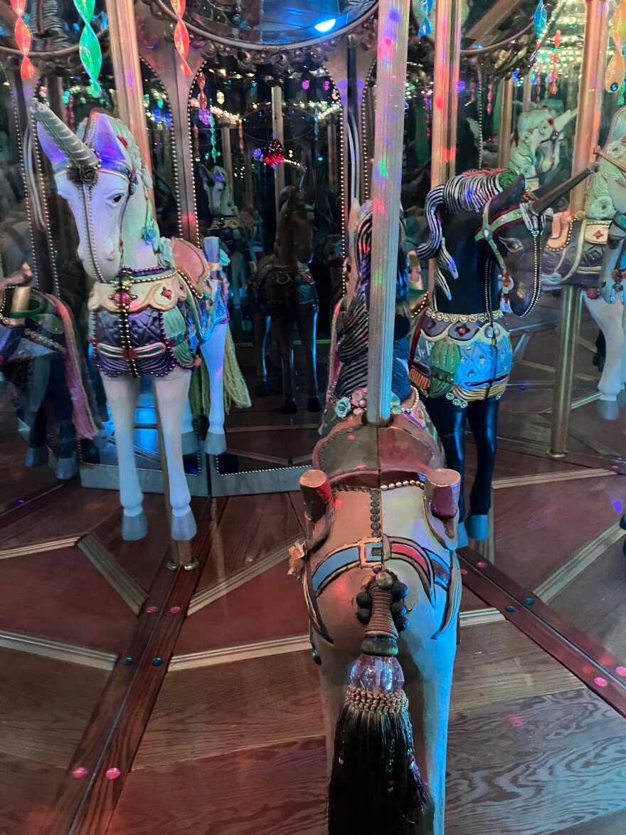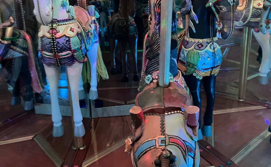 One carousel piece uses carved wooden horses, and Chouteau split them in half and affixed them to mirrors, so they look like whole horses, and multiplied with all the reflections.